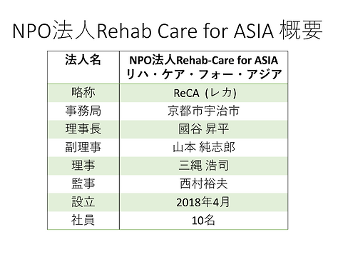 私たちは、高齢化が進むアジア諸国に対して適切なリハビリテーションや介護の普及を目指している団体です。メンバーは理学療法士や作業療法士、看護師、社会福祉士、管理栄養士などの専門職が参画しています。また、経営者やデザイナーなどもメンバーに置いており、様々な意見を取り入れながら活動を行なっています。